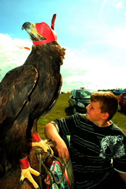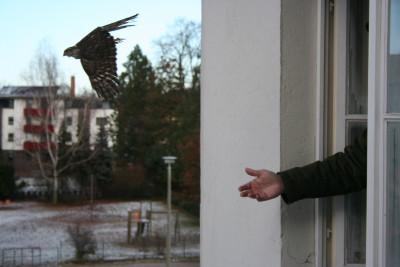 Dieser Seeadler ist 30 Jahre alt. Verwendet wird er um adulte Schreiadler und Fischadler zu fangen. Diese werden beringt und besendert um ihr Zugverhalten zu erforschen. Der Adler ist im Besitz von Herrn Prof. Dr. Bernd- U. Meyburg.